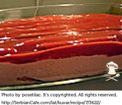 Ređati naizmjenično, dok se masa ne potroši i na kraju preliti sa 1/3 mase od jagoda.