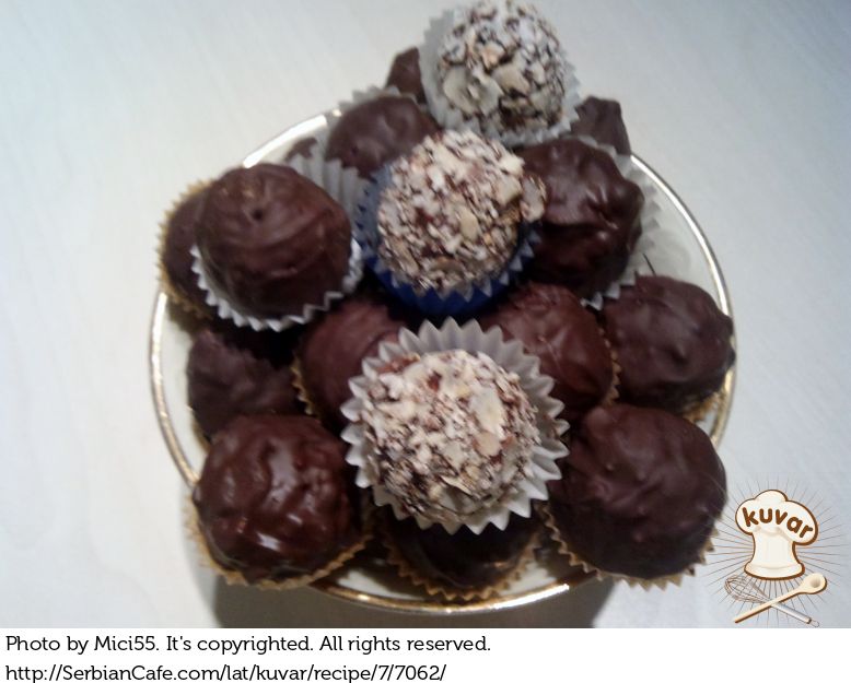 Na pari otopiti 150 g čokolade pa svaku kuglicu zamočiti u čokoladu, a zatim u seckane lešnike.