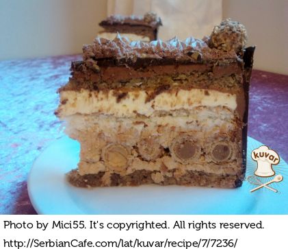 Ovo je jedna posebna torta, koju sam sa puno ljubavi pravila za jednu posebnu osobu, moju bratanicu. Na žalost, od samog početka je sve krenulo natraške. Original torta je pravougaona, a ja sam htela okruglu tortu. Ne razmišljajući da će okrugla biti manja, i da treba da smanjim količinu jaja i ostalih sastojaka, umesto jedne kore dobila sam celu pogaču. Razmišljajući šta ću sa tolikom korom, dođem na ideju da je presečem na pola i umesto dve kore koje sadrži original torta, ova moja ima tri. Takođe sam morala da smislim još jedan fil, jer je bilo premalo za tri kore.
