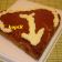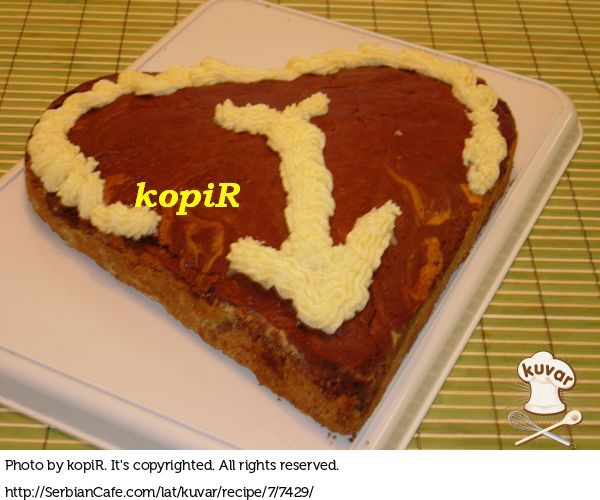 Svetlu masu izručiti u pleh u obliku srca, postavljen papirom za pečenje, preko naneti braon masu i viljuškom rasporediti.