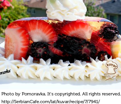 Staviti u kalup 8x16 cm sve voće koje imate, preliti sa smesom od želatina i ako je potrebno nežno pritisnuti voće da je sve potopljeno u tečnost, ako je potrebno odvadite malo voća.