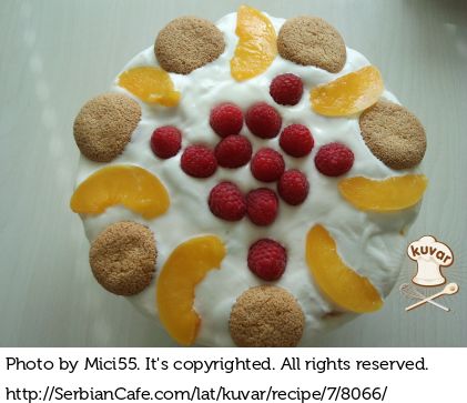 Na dno staklene posude staviti malo makarona pa sipati jedan deo jogurta, posuti seckanim breskvama i malinama pa opet posuti makaronima.