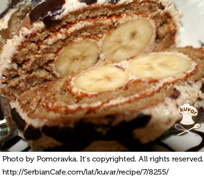 Ohlađeni rolat odviti, poprskati ga mlekom ili rumom, i dve trećine fila premazati preko kore. Oljuštiti 4 banane i postaviti dve u jednom redu jednu iza druge i odmah pored njih staviti još dve, jednu iza druge. Uviti u rolat, premazati ostatkom fila i preliti sa malo otopljene čokolade, ako želite, ako ne, ostavite tako kako je.