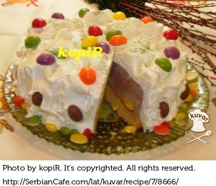 Posle navedenog vermena premazati celu tortu umućenim šlagom, ukrasiti i do služenja držati u frižideru.