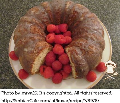 Ugrejati šporet na 350 F. U veliku činiju spojiti sastojke za kolač. Sve zajedno umutiti lagano mikserom i istresti u podmazani kuglof. Peći 30-45 min. Zadržati ispečeni kuglof u kalupu desetak min.i onda ga izvaditi.
