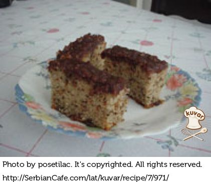Umutiti testo od 3 jaja, 6 šoljica šećera, 2 šoljice mlevenih oraha, 2 šoljice ulja, 4 šoljice mleka, 5 šoljica brašna, i pola kesice praška za pecivo. Možete dodati i 50 g suvog grožđa ako želite. Podmazati pleh i peći. Pečeno testo preliti prelivom koji napravite od: 6 kašika vode, 10 kašika šećera kristal, 4 štangle čokolade, 125 g margarina, 5 šoljica mlevenih oraha. Šećer i vodu malo ušpinovati i dodati sve ostale sastojke. Preliv malo prohladiti i preliti po testu ravnomerno. Kolač obavezno da odstoji jedan dan. Veoma je lep i izdašan.