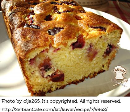 Po smesi rasporediti voće i peći na 180-200°C dok kolač lepo ne potamni i odvoji se od ivica posude. Može se posuti šećerom u prahu, ali ja nisam.