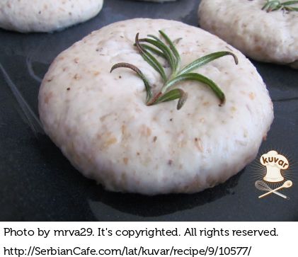 Svaku lopticu staviti u tepsiju obloženu papirom za pečenje. Ostaviti sa strane 10 ak min.da loptice narastu. Svaku lopticu malo pritisnuti rukom. Zatim premazati umućenim belancetom i u svaku lopticu staviti malu grančicu ruzmarina.